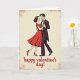 This Valentine's Day card shows a couple dancing close together in the center, sharing a sweet look as they hold hands. The background is a warm, light cream tone with a lightly worn texture that feels like old paper. The woman wears a red dress with white polka dots, a full skirt that flares out, and red high heels, and she looks up at her partner with rosy cheeks and a soft smile. The man wears a black tuxedo with a white shirt and a black bow tie, and he looks back at her with a calm, caring expression. Their pose feels like a classic ballroom dance, with his arm around her and their hands joined, setting a romantic and close mood ❤️. Along the bottom of the card, the words “happy valentine’s day!” appear in flowing script, standing out clearly against the pale background 💌. The edges of the design look slightly faded and worn, which adds a cozy, nostalgic touch 🍫.