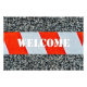 Red and white plastic do not cross warning tape, to mark the police or construction line, turned around gray granite stone. Text - Welcome - added.