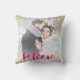 This stylish Christmas pillow says "believe" in trendy red watercolor look script, with faux gold splashes and two of your own personal photos.