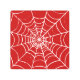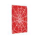 A spider's web forms in a bold, blood-red colored void.
