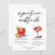 This sophisticated red signature cocktails menu sheet features simple black typography above 2 of your favorite drinks and their ingredients for your coastal wedding bar. A chic Red Wedding drink and Cherry French 75 drawing add a fun flair to your bar menu. Complete with the couple's names and date for their reception.