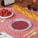 Celebrate in style with these artistic paper plates. The outer curved part is decorated with a red and white abstract line drawing, and the center of the plate is solid red.