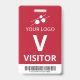 Vertical visitor badge with a simple design in white against a matte red background. A large white V makes it easy to quickly recognize the visitor as such. Personalize with your business logo and a bar code.