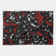 A cool, modern and eye-catching musical design featuring a random jumbled pattern of musical notes and treble clefs in red and white on a classical black background.