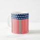 The stars and stripes of the USA flag in a traditional red, white and blue. The blue field of stars from the American flag borders the top of this All-American pattern. The bottom portion is covered with the repeating red and white stripes of the flag. The perfect way to show your patriotic spirit.