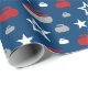 Wrapping paper featuring a stars and curling rocks pattern in red, white and grey on blue background. Perfect for curlers and curling fans.