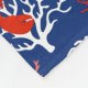 Eyecatching coastal blanket patterned with red lobsters and white sea coral over a navy blue background
