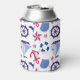 A colorful nautical pattern is the feature on this personalized can cooler. Images include an anchor, a ship's wheel, a life buoy, a sailboat and a pennant. The images are in red and blue, and placed on a white background. At the top is a solid navy section bordered in red. The top section has your name in white between two white anchors.