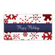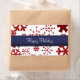A festive design featuring red snowflakes in a variety of shapes and sizes. A green band accents the words 'happy holidays'
