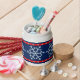 Lovely candy jar in red, white and blue with a snowflake motif. This design is available on ceramic products to create a full tea or coffee set, including mugs in several sizes (including bone china!), pitchers, tea pots, small jars for candy or sugar, and espresso mugs.