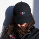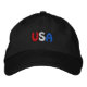 Red, white and blue USA embroidered on an attractive black baseball cap. Patriotic gift. Political cap. Create your own gift.