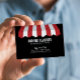 This business card features a red and white illustration of an awning against a black background, with key details presented in white. The back of the card provides space for a comprehensive list of services.