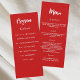 Program and menu card. Personalize and add your name, date and the menu. Red background, white text.