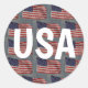 This round sticker features the Red, White and Blue US Flag on a fuzzy background with a tiled pattern. The word "USA" appears in big white letters on top. It's good for everyday use, special occasions, as well as Independence Day, 4th of July, patriotic celebrations. You can customize it if you like. Brighten up packages and more with this eye-catching sticker!
