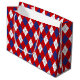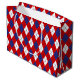 Red, White and Blue Argyle, 1-GIFT BAG-An allover diamond shaped pattern created in patriotic red, white and blue colors. The diamond shapes alternate in all three colors. The digital stitching is blue. This design is suitable for certain holidays as well as many other occasions through out the year. The pattern coordinates with others in a complete red, white and blue party theme. You can find argyles, chevrons and even home- spuns to coordinate, mix or match. Choose any size of Zazzle gift bags.
