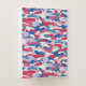 A camouflage print with red white and blue colors based on the same hues as the official colors of th US flag.