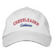 White cotton ball cap, with red embroidered text reading CHEERLEADER, in a slight arch shape. Additional blue embroidered text, under Cheerleader text, is ready to personalize. Great for cheerleaders and cheer coaches.
