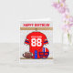 A personalized birthday card with an American football grid iron design featuring a football jersey in red with blue and white stripes, hanging in a sports locker room with a football helmet, water bottle and football. The text on the sports jersey can be customized with the name and age of the Birthday boy or Birthday girl. The text on the front and the inside of the card can be customized with your own special message. A great card for a football themed birthday or for the person who is a football player or grid iron fan.