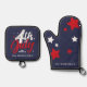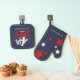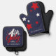 Patriotic Red White and Blue Independence Day 4th Of July theme with family name oven mitt and pot holder set. Makes a great gift or addition for this Independence Day 4th of July cook out.