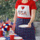 This print all over apron features a patriotic design. A red and white star print is on a solid blue background and the white bit has a red heart and flag inspired USA. Wear this apron to your 4th of July parties. Its perfect for holiday gatherings.