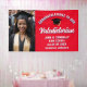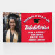 This modern red, white, and blue custom senior photograph graduation party banner for a valedictorian features classy typography of your high school or college name for the class of 2025. Customize with your graduating year under the chic handwritten script and black grad cap for great personalized graduate photo decor.