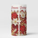 Bring warmth and charm to your holiday celebrations with this unique pattern, featuring bright red and white flowers, fluffy bunny tail grass, and shiny gold berries on a rich, dark red background. The vibrant poinsettias contrast beautifully with the subtle texture of the bunny tail grass, while the gold berries add a hint of glamour and sparkle to this beautiful pillar candle design. Personalize with a name and/or holiday greeting using the provided template. Search ID1009 to see other products and patterns in this color scheme.