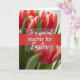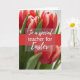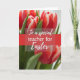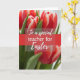 This card shows a close-up bouquet of spring flowers, with red petals edged in white that look freshly opened and carefully detailed. Soft, diffused light falls across the blooms, bringing out gentle shadows in the folds and giving the scene a tender, affectionate mood like a quiet note shared between close friends. Green stems and small new leaves frame the blossoms, adding a natural contrast that keeps the arrangement grounded and fresh. The background fades into a smooth blur, so the flowers stay in sharp focus while the setting feels calm and intimate, with a small 🌷 touch of spring. Across the middle, a semi-transparent deep crimson band runs horizontally, cutting through the floral cluster without hiding it completely. Centered on that band is a flowing white message of thanks, sized large enough to read easily and placed right at eye level, with a small 🐇 accent nearby. The red-and-white petals remain the brightest detail, while the crimson band and white lettering sit neatly across the midsection against the softly blurred backdrop.
