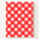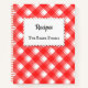A notebook with a retro red and white gingham plaid pattern of checks and stripes with block and script letters, on a faux doily for your homemade recipes.