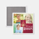 This red, white, and gold Christmas magnet has a pretty gold Christmas tree on it and has three photo template areas for you to add your own photos to. Its small enough to fit inside your Christmas cards to give loved ones a nice little gift for on their fridge. The matching Christmas card is shown below.