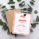 A modern and stylish invitation for a graduation party. For both him and her. White background, red text and a frame. A black graduation cap.