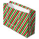This gift bag design features fun and festive patterns of red, white, and green colored Christmas themed stripes. A gift bag like this might be used when preparing presents being given to celebrate Christmas.