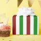 This wrapping paper design features Christmas inspired stripes colored green, white, and red. Wrapping paper like this might be fun to use when preparing gifts or presents being given in celebration of a birthday, a wedding, an anniversary, or some other event.