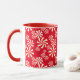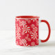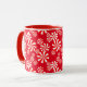 A mug with a sweet red and white striped peppermint candy pattern on a red background.