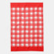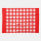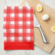 A retro red and white plaid kitchen towel with red borders.