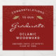 Celebrate your graduate's milestone in style with these custom graduation sparkling wine bottle labels, featuring the words "Congratulations to our Graduate" in white text on a red background. The word "Graduate" appears in a graceful handwriting-style script. A pair of gold faux glitter mortar board caps and a scattering of gold confetti decorate the top portion of the label. Personalize it with your grad's name, school, and year of graduation.