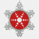 Red and white drawing of a snowflake made of hearts is printed on snowflake shaped ornaments. The background color of red can be customized.