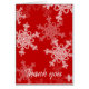 This stylish and festive thank-you card is perfect for winter-themed celebrations. It features a bold red background adorned with intricate white snowflake patterns, adding a touch of elegance and charm to the design. The text is customizable, allowing you to include your names and a heartfelt message, beautifully displayed in a combination of flowing cursive and classic serif fonts. Ideal for winter weddings, holiday events, or seasonal gatherings, this card is a thoughtful and stylish way to express your gratitude with a festive touch.