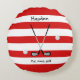 Add a name to personalize this golf-themed pillow. You can also customize the caption which reads "Eat, sleep, golf" in black text. The design has crossed golf clubs and two golf balls on a red and white striped background. On the reverse side is a repeating pattern of golf balls, on a red background.