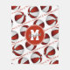 This cute basketball themed fleece blanket features a mirrored pattern of basketballs that have alternating recolored red and white panels - the phrase "The basketball court is my happy place" in a casual handwritten-style font along with heart shapes in red stretches between the angled rows of basketballs - athlete name and monogram can be personalized on the large overlying circle pendant - background is customizable white - easily replace the monogram with the player's varsity letter or jersey number - by katz_d_zynes