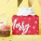 Red and white, modern typography in white with a Merry Christmas greeting on red background with snowflake pattern and name to personalize.
