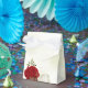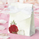 Beautiful wedding favor box featuring red and white flowers and green leaves