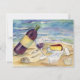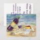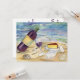 A bottle of red wine tilts against a half full wine glass on the beach. A platter of cheese is ready to be cut, as well as, a second wine is ready to be filled. Seashells are intermingled on the sand beach. Soft pastel colored ocean waves are splashing in the background. The wine label can be personalized for your own message on a bottle! Painting rendered in watercolor. Add your own text to the back of the red wine beach party invitations. Make customized invites with your own text and images for your party invite!