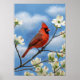 A vibrant red northern cardinal sits on the branch of a dogwood tree, surrounded by delicate white blooms. The blue sky provides a wonderful contrast to this image, and the oil painting look adds an extra touch to this striking image.