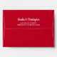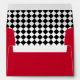 Envelope with custom name and return address in red with a black and white checkered lining.