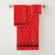 Bright red towel set with small yellow polka dots. Red background color with a pattern of yellow polka dots. At the top and bottom are dark red horizontal stripes.