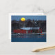 Old red wooden boathouse with full moon setting on the background and icy Baltic Sea on foreground in Lauttarsaari, Helsinki postcard.