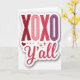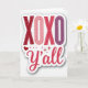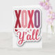 This greeting card puts “XOXO y’all” front and center in a fun, sticker-style design. “XOXO” sits at the top in big uppercase block letters, with the first and third X in deep red and marked with a dashed, stitched-looking pattern. The two O’s are softer shades—one light pink and the other a muted purple—and they have the same dashed detail to match. Underneath, “y’all” is written in a smooth script in bright red, placed right below the big letters. On the left side there’s one larger red heart followed by three smaller hearts, and on the right there are little starburst shapes that add a happy sparkle. Everything sits on a white background with a white outline and a slight shadow that makes it look like a sticker you could peel up. It feels warm and friendly for romance or close friendship, and the simple colors make the message easy to read ❤️