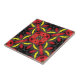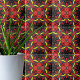 Modern and vibrant ceramic tile design featuring geometric shapes in kaleidoscopic style in red, yellow and black.