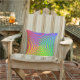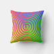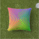 This colorful outdoor pillow features an abstract spiral rainbow pattern swirling around a central target in colours of green, blue, yellow, orange and red.