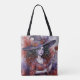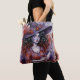 This whimsical tote bag features an oil-style illustration of a red-haired witch in a purple hat and floral dress, holding a daisy wand amid swirling red and lavender brushstrokes. Finished in a oil acrylic impasto painterly.